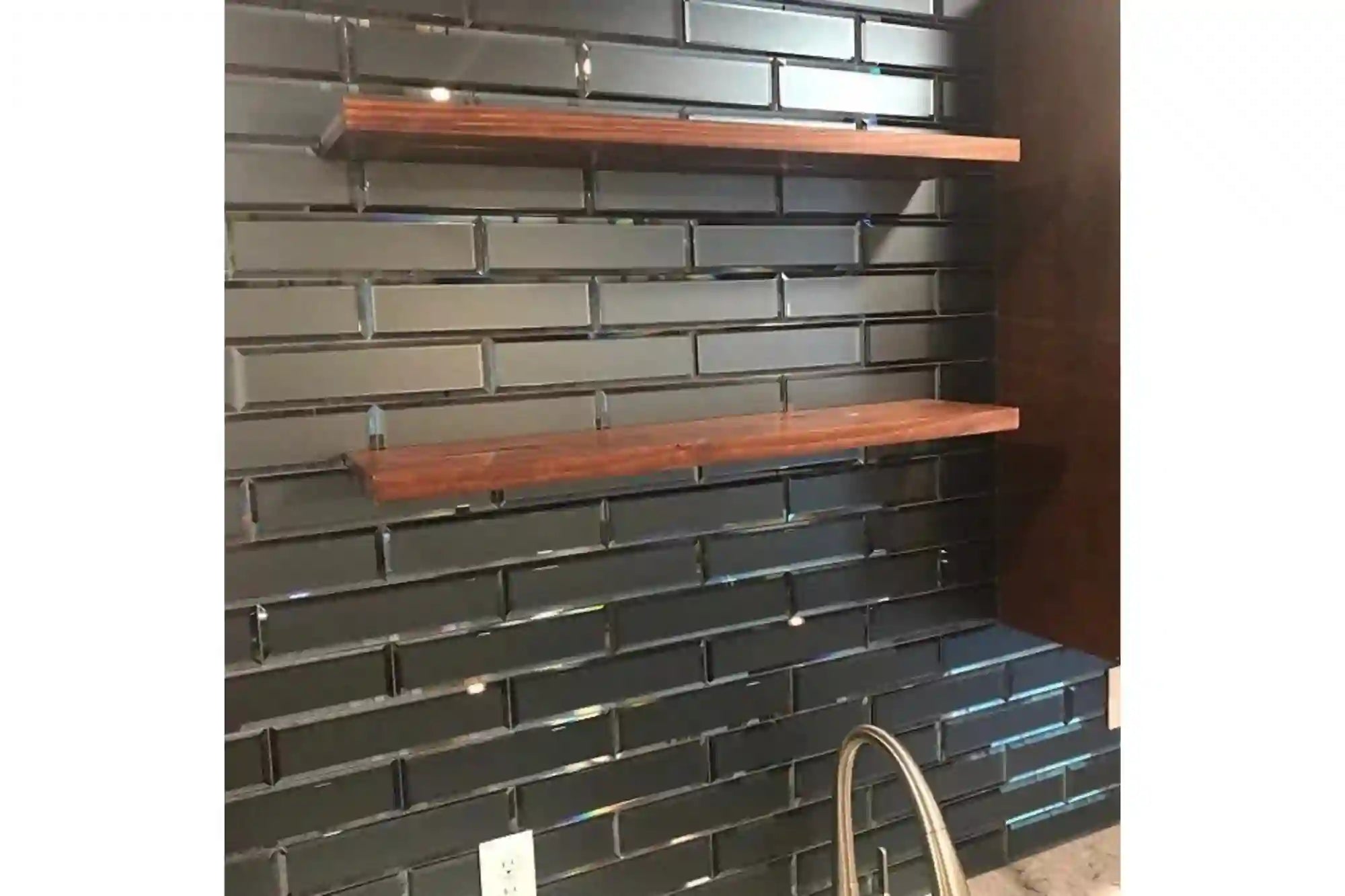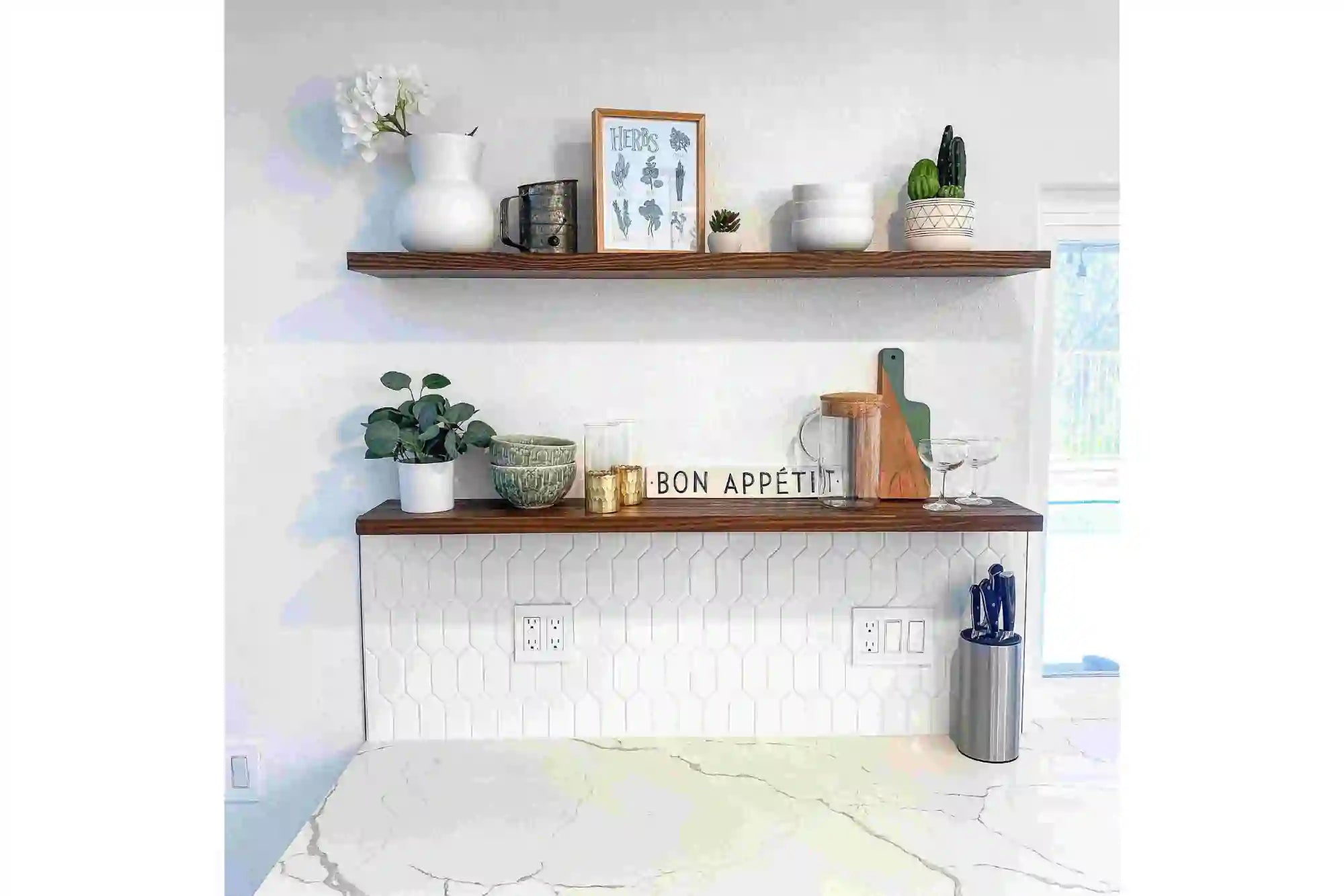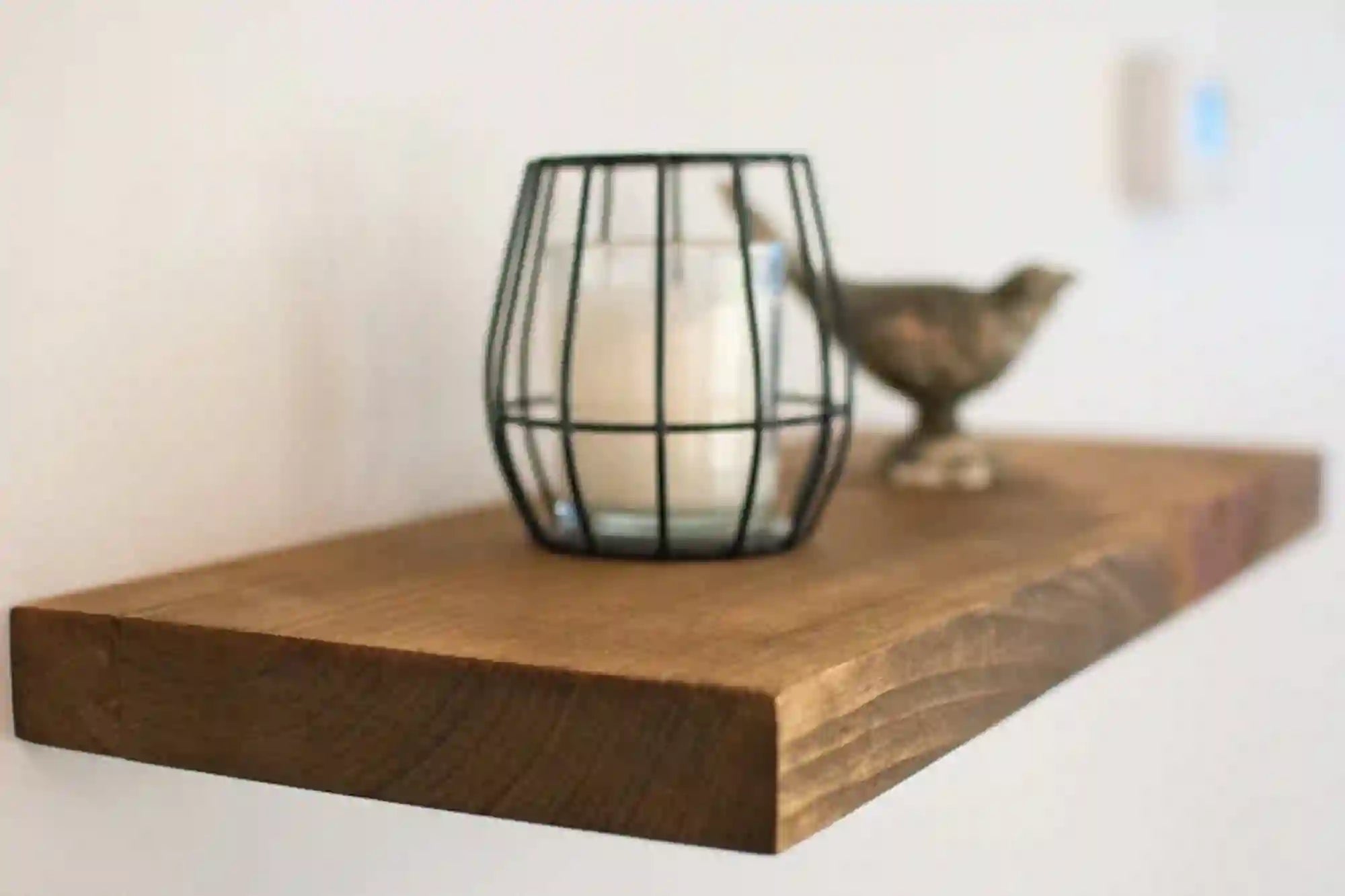 This custom pine floating shelf design is constructed from and is created using dowel rods and a bracket made from the shelf. All edges will be smooth finished, but some pine wood characteristics will still be present such as knots, uneven grain patterns, small cracks, etc. We personally believe that this adds character to the shelves, but understand it may not fit the aesthetic you're looking for. Please keep this in mind as you are making your purchase.  The final thickness of each shelf is 1.25".