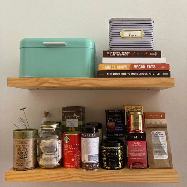 This durable design is constructed from locally sourced pine wood and is created using dowel rods and a bracket made from the shelf. All edges will be smooth finished, but some pine wood characteristics will still be present such as knots, uneven grain patterns, small cracks, etc. We personally believe that this adds character to the shelves, but understand it may not fit the aesthetic you're looking for. Please keep this in mind as you are making your purchase.