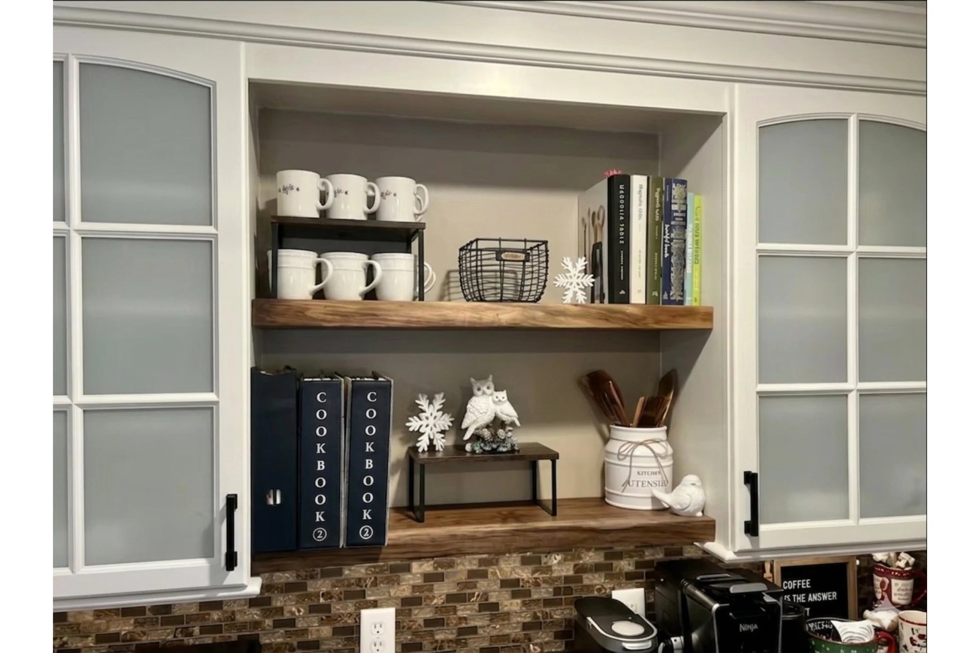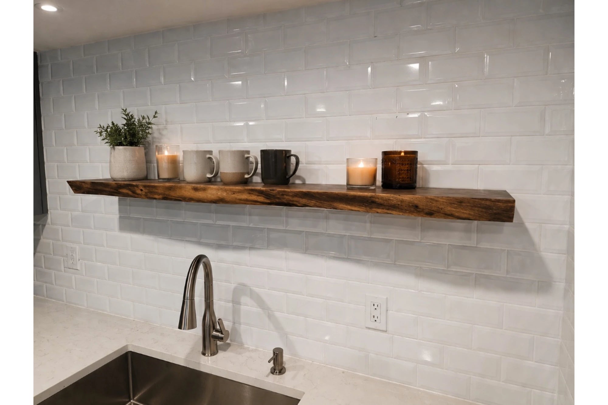- Solid walnut, natural live edge: Every shelf is unique with knots, filled cracks, or inclusions.